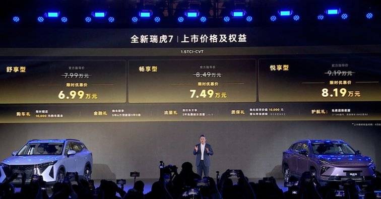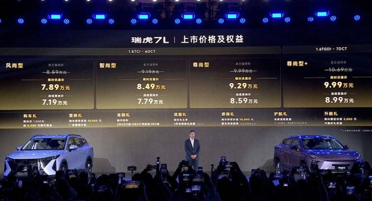 4月8日,奇瑞汽車以“問(wèn)鼎雙百萬(wàn) 雙虎耀全球”新車發(fā)布會(huì)舉行,奇瑞瑞虎7L、新款瑞虎7、瑞虎5運(yùn)動(dòng)版三車上市,為年輕家庭帶來(lái)10萬(wàn)內(nèi)SUV的更優(yōu)選。款車型具體價(jià)格如下:瑞虎7L售價(jià):8.59萬(wàn)元-10.69萬(wàn)元,限時(shí)優(yōu)惠價(jià):7.89萬(wàn)元-9.99萬(wàn)元,超級(jí)置換價(jià):7.19萬(wàn)元-8.99萬(wàn)元。新款瑞虎7售價(jià):7.99萬(wàn)元-9.19萬(wàn)元,限時(shí)優(yōu)惠價(jià):6.99萬(wàn)元-8.19萬(wàn)元。瑞虎5運(yùn)動(dòng)版售價(jià):7.99萬(wàn)元-8.99萬(wàn)元,限時(shí)優(yōu)惠價(jià):7.09萬(wàn)元-8.09萬(wàn)元,超級(jí)置換價(jià):6.79萬(wàn)元-7.79萬(wàn)元。