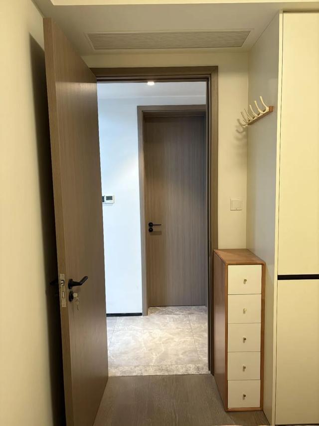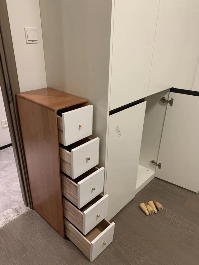我家臥室門后就是一排床尾柜,本來(lái)已經(jīng)單獨(dú)做了一組深柜,但門和柜體之間還是有一塊9cm空間。
