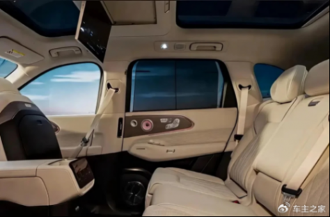 接下來看看其他配置,首先,側(cè)窗可以明顯看到極氪8X配備了側(cè)窗遮陽簾,而后排娛樂屏則由9X可移動的飛翼屏變?yōu)榱斯潭ㄊ降膽腋∑粒贿^畢竟極氪8X車身尺寸和空間要更小一點,所以不用飛翼屏也無所謂,還能節(jié)省一定的成本。