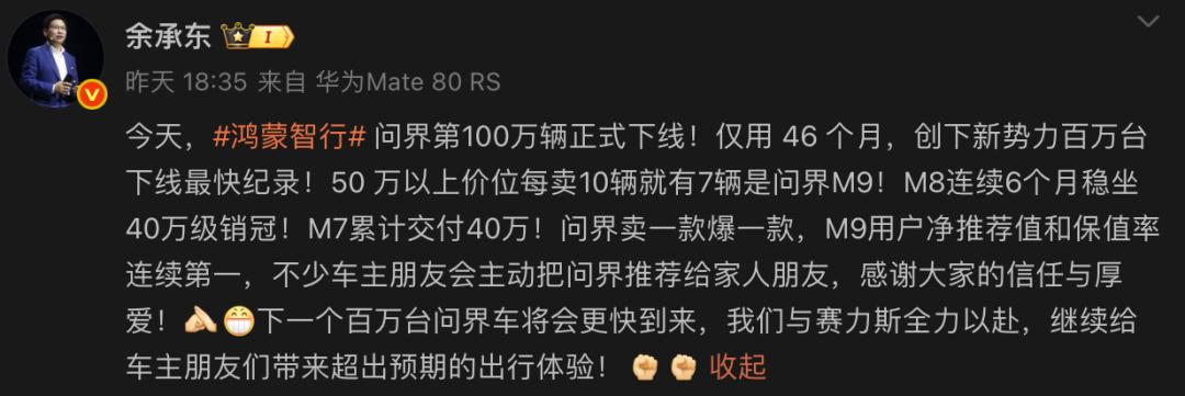 在現(xiàn)場(chǎng),華為常務(wù)董事、終端BG董事長(zhǎng)余承東對(duì)這個(gè)成績(jī)的評(píng)價(jià)很直接——問界的百萬之路,是“出一款爆一款”的市場(chǎng)認(rèn)可,更是中國(guó)品牌打破外資豪華壟斷的突圍。