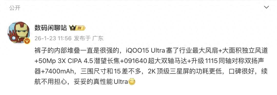 這款機子的出現,直接拉高了2026年旗艦手機的配置門檻。2月初發布后,官網已經開啟預約,從目前的爆料來看,頂配24GB+1TB版本的價格大概率在7000元左右,還搭配了三年電池保修、五年風扇專屬保修等福利,這個配置和售后的組合,對于游戲玩家來說性價比不低。iQOO一直主打電競體驗,這次的iQOO15 Ultra更是把自家的技術優勢全用上了,自研芯片、散熱系統、觸控技術的結合,讓它的游戲體驗比普通旗艦更專業,比專業電競手機更實用。