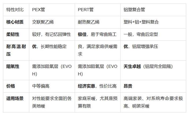 家里裝地暖,埋在地下的管子是“隱形主角”。它一旦鋪好,用上就是幾十年,選錯了麻煩可就大了。市面上主流的地暖管材主要是三種:PEX管、PERT管和鋁塑復合管。它們到底有啥區別?普通家庭該怎么選?今天就用一張表給你講清楚,再也不怕被忽悠。