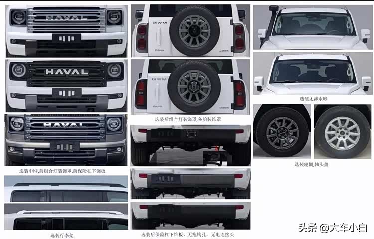 從申報信息來看,新H9將提供極為豐富的選裝配置,涵蓋車輛各個部位和功能。外觀方面,消費者可以選擇不同風格的中網、前后保險杠下飾板、行李架、前后組合燈裝飾罩*以及備胎裝飾罩。對于不需要拖掛功能的用戶,車輛還提供“無拖鉤孔、無電連接頭”選項。