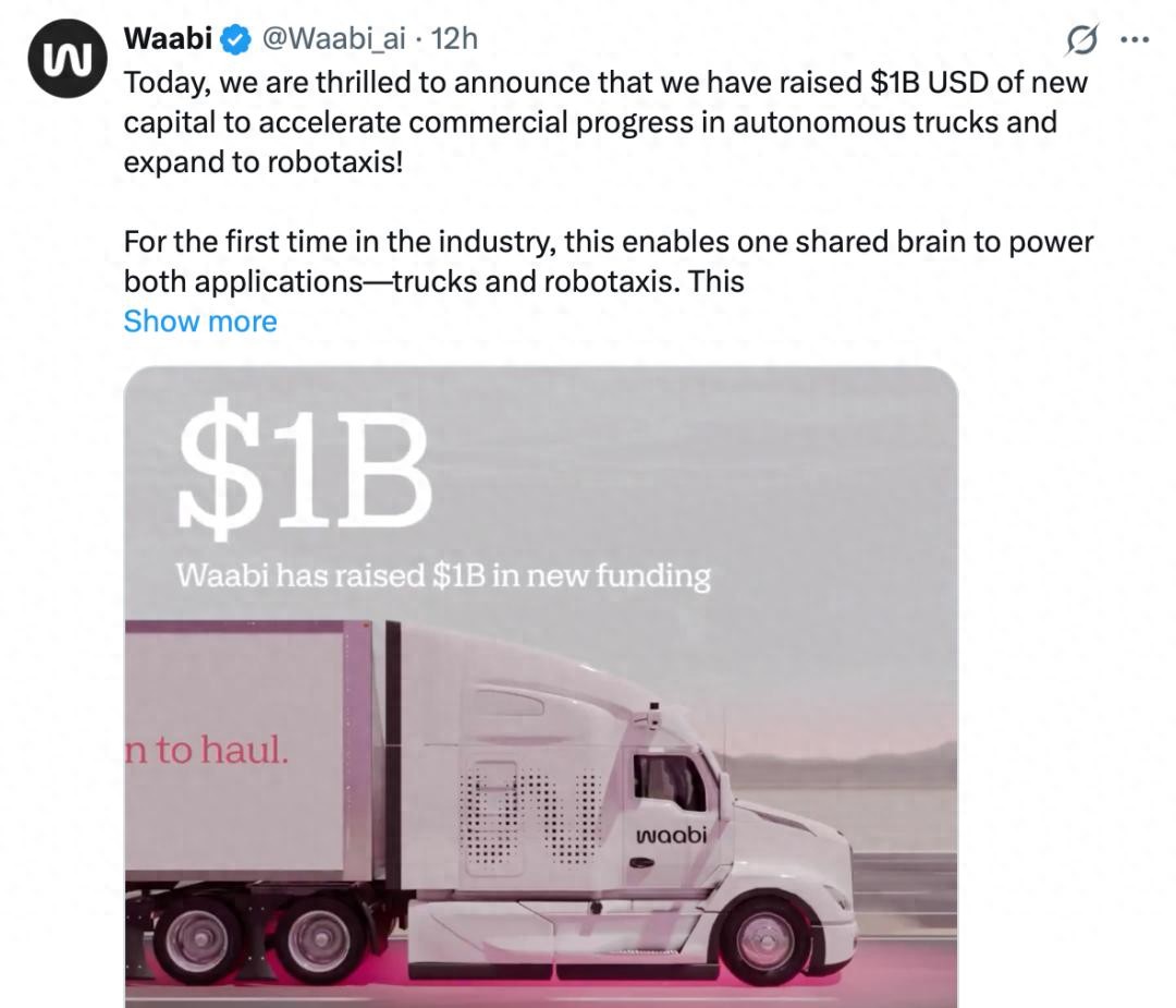 自動駕駛汽車初創公司Waabi官宣融資10億美元