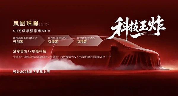 作為嵐圖第二款MPV車型,嵐圖珠峰定位“科技王炸”,主打50萬元級中高端市場。嵐圖珠峰將全球首發12項黑科技,成為全球首個搭載L3自動駕駛的MPV以及首個擁有超級魔毯的MPV車型。