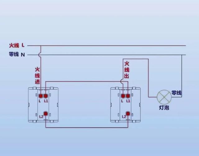 火線進去左邊雙控開關公共端L,再把兩個雙控開關的L1和L1連接,L2和L2連接,最后把右邊雙控火線出接到燈泡,回到零線就可以了,是不是很簡單,學會這個,以后家里一些簡單電路自己就能輕松搞定了,再也不用花錢請別人了。
