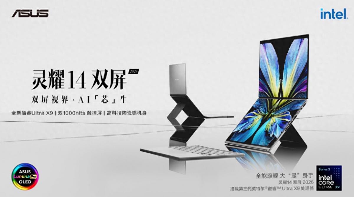 說到雙屏筆記本,華碩是行業中一直堅持做新品開發和體驗升級迭代的品牌,尤其是2022年發布的靈耀X FOLD和去年發布的靈耀14 雙屏AI雙屏本,以B面+C面雙14英寸OLED屏和物理磁吸實體鍵盤的創新性設計,一舉解決B/C雙面大屏輕薄本使用過程中遇到的痛點。隨著英特爾酷睿Ultra X9第三代處理器最新平臺的發布,華碩靈耀14 雙屏 2026從屏幕、性能和體驗全面升級,有購買需求的小伙伴可以多加關注,新機預約階段更實惠。
