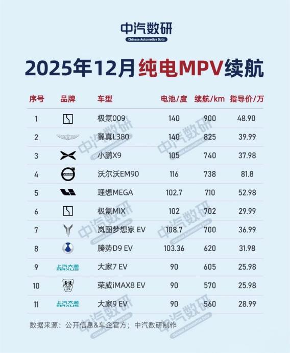 MPV車型因車身笨重、風阻較大,以往續航表現一直不如轎車和SUV,但2025年在售車型中,多款MPV實現續航突破,上榜的3款車型續航均突破740公里,其中兩款車型續航達到825公里以上,徹底打破“MPV續航弱”的固有認知,適配家庭長途出行和商務接待等多場景。