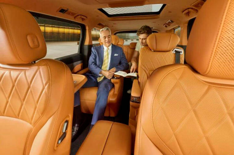 車(chē)內(nèi)配置強(qiáng)調(diào)豪華與智能。包括零重力座椅(帶按摩功能)、全溫區(qū)冰箱、智能大屏及多模態(tài)交互系統(tǒng)。提供三種座椅布局:2+2四座、2+2+2六座、2+2+3七座,其中四座版配備隔斷設(shè)計(jì)與后排巨幕電視。