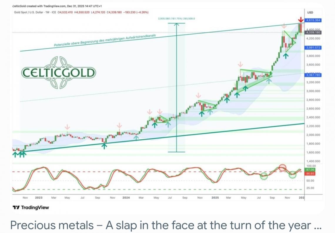 進入2026年1月前,黃金累計漲幅已超過60%-70%,白銀漲幅更夸張,接近150%。價格走勢呈明顯的“拋物線”上漲,技術面嚴重超買:RSI指標多次觸及90以上(正常超買線為70),MACD等動量指標也出現頂背離信號。