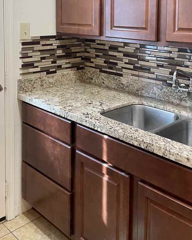 阿什頓向上移動,使用仿肉鋪風格的接觸紙覆蓋了現有的花崗巖臺面,并在后擋板上懸掛了仿卡拉拉大理石的接觸紙。她還用Behr的蠟雕給墻壁刷了漆,并用Behr的漸變藍給門的內部上了漆。