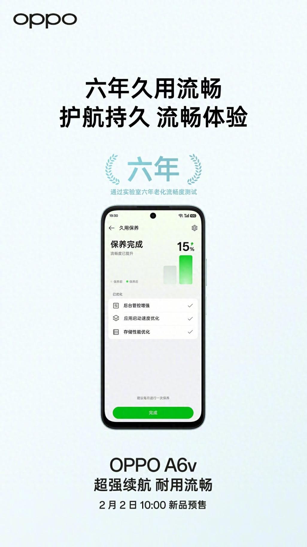 2 月 1 日消息,OPPO A6v 手機將于 2 月 2 日 10:00 預售,號稱“超強續航,耐用流暢”。