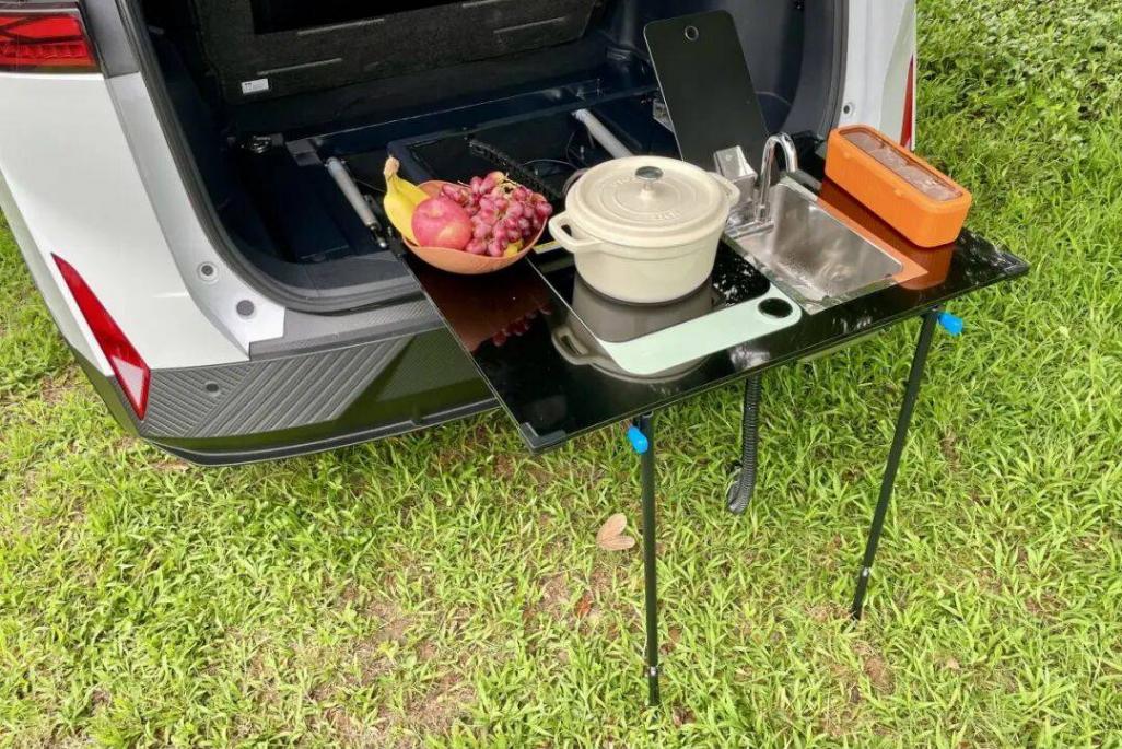 感受完“上下雙床”,再來看“移動廚房”:打開車尾門,原備胎位置現在則暗藏“后備廂廚房精品包”。該套件支持電動一鍵升降、前后抽拉,收起時完全“隱形”,絲毫不侵占490L之后備廂空間。套件展開后,黑色的不銹鋼臺面不滲色、易清潔,積水一抹就干凈。