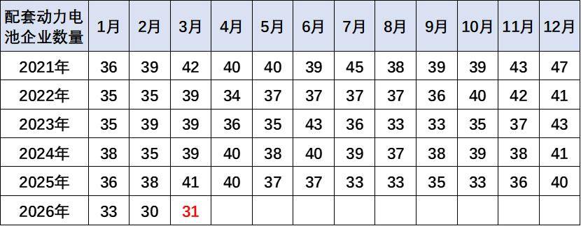 過去幾年,電池市場的競爭格局并沒有發(fā)生明顯的變化,。2026年3月配套電池企業(yè)是達(dá)到31家的低位。由于動(dòng)力電池市場的技術(shù)進(jìn)步相對比較緩慢,而規(guī)模增長特征相對明顯,加之儲(chǔ)能等新產(chǎn)業(yè)需求發(fā)展,因此電池企業(yè)獲得了較強(qiáng)的生產(chǎn)和裝車數(shù)量增長的特征。