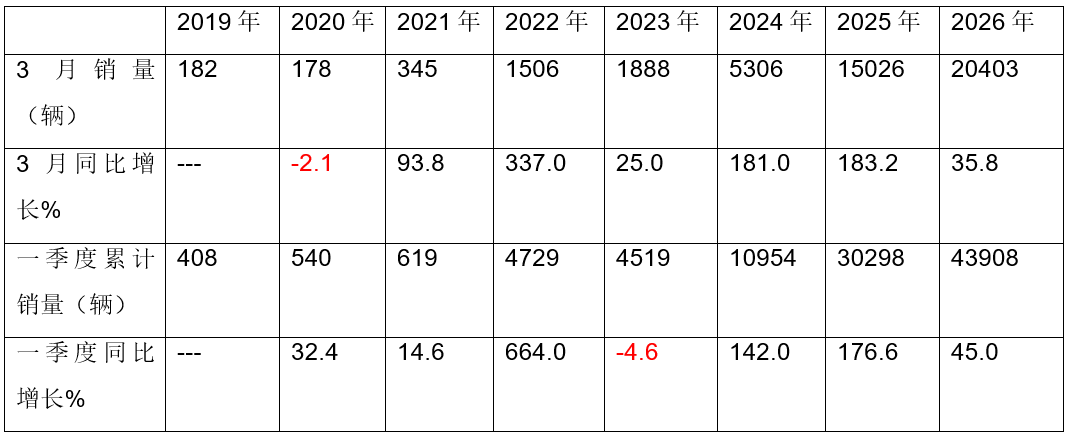 在近8年3月的國內新能源重卡終端銷量中,2026年3月銷量20403輛,創近8年同期新高,也是近年同期惟一銷量超過20000輛的月份,也創下史上同期新高!可見今年國內新能源重卡市場的“金三”如約而至!
