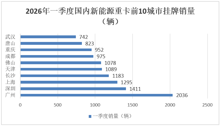 上圖可見,在2026年一季度國內新能源重卡銷量Top10城市中,廣州是銷量惟一超2000輛的城市,可謂一家獨大;深圳與上海分別位列第二、第三;累計銷量超1000輛的城市有6座,分別為廣州、深圳、上海、長沙、天津、佛山。Top10城市累計銷量占比26.4%,可見目前我國新能源重卡區域流向不均衡。
