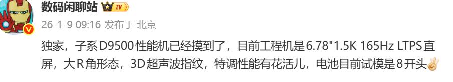 關于這部手機博主@數碼閑聊站也曾爆料過,該機搭載天璣9500芯片,屏幕使用6.78英寸 1.5K 165Hz LTPS直屏,且有3D超聲波指紋和8開頭續航電池。