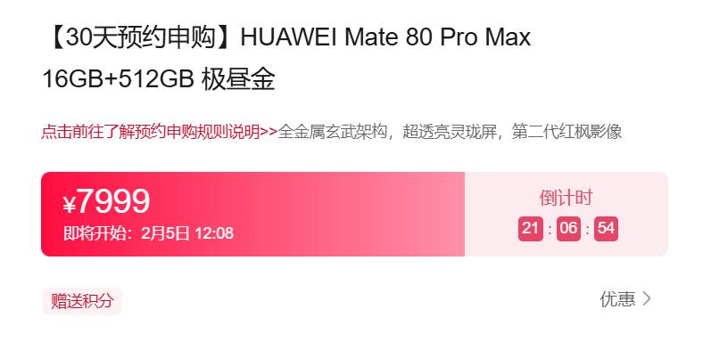 2月4日,華為官方正式宣布,為了讓更多的消費(fèi)者可以體驗(yàn)到Mate 80 Pro Max和Mate 80 RS 非凡大師這兩大旗艦,華為商城在2月5日12:08,將對(duì)這兩款產(chǎn)品開(kāi)啟熟悉的:“30天預(yù)約申購(gòu)”。