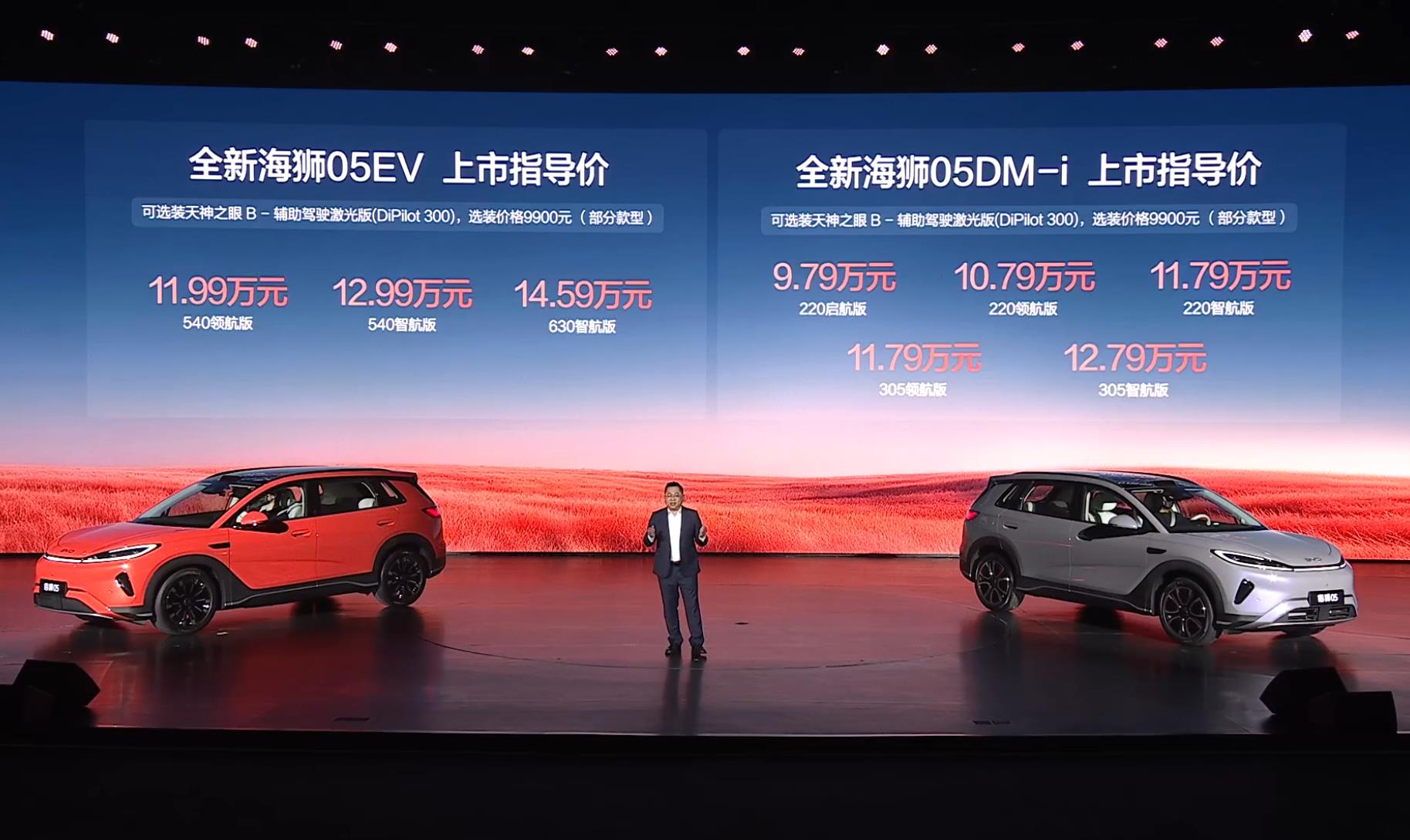 新能源車雜談訊,4月20日,全新海獅05 DM-i和全新海獅05 EV上市,插混版提供5款配置,指導售價9.79-12.79萬元,性價比相對其他同級還是蠻有優勢的。純電版提供3款配置,指導售價11.99-14.59萬元。全系標配云輦-C智能阻尼車身控制系統,TBC高速爆胎穩行系統和天神之眼C。