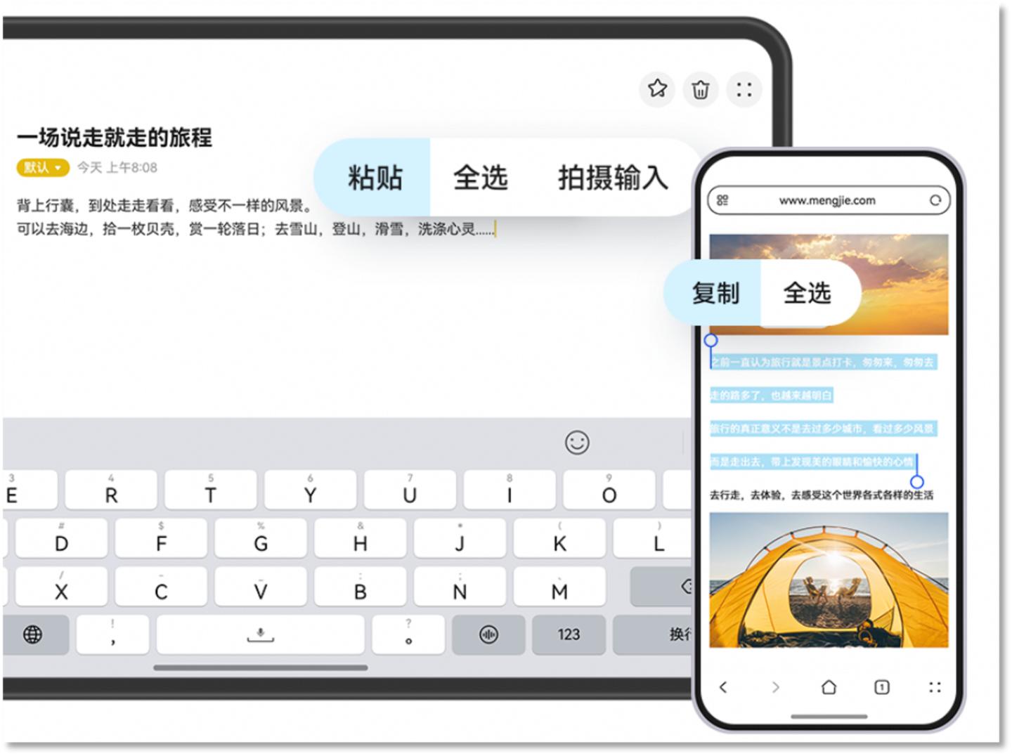 通過跨設備剪貼板,可在多設備間復制粘貼文本、圖片、文件等,方便您用一臺設備創作構思時,輕松獲取到另一臺設備上的素材。還支持短信驗證碼的跨設備復制粘貼,方便應用的跨設備登錄。