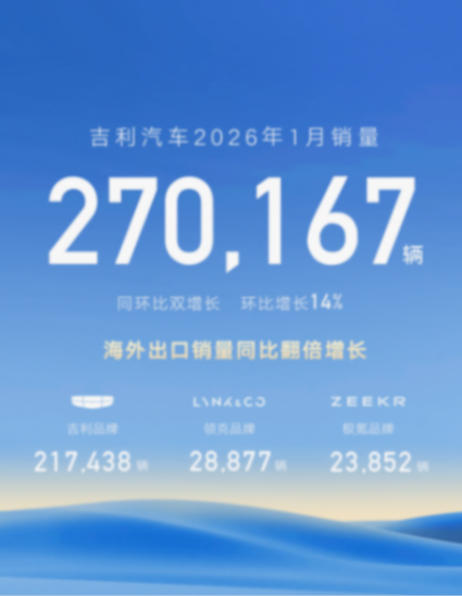 2月1日,吉利汽車控股有限公司(0175.HK)公布最新銷量數(shù)據(jù)。2026年1月,吉利汽車乘用車銷量達270167輛,同比增長1%,環(huán)比增長14%,開年首月即展現(xiàn)出穩(wěn)健的發(fā)展勢頭。