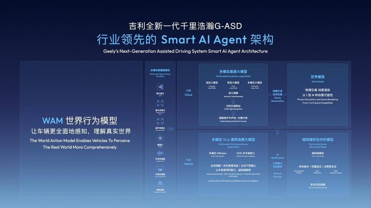 在WAM模型的賦能下,吉利汽車新一代千里浩瀚輔助駕駛系統(tǒng)——千里浩瀚G-ASD也正式發(fā)布,可為吉利體系下的用戶提供同等級下最優(yōu)質(zhì)的體驗。2026年,在法規(guī)允許的前提下,吉利將逐步推送高速L3、城區(qū)L4功能,并啟動Robotaxi試運營。