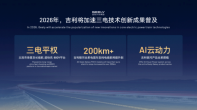 在電池領(lǐng)域,2026年,吉利神盾金磚電池將推出全新磷酸錳鐵鋰材料體系,電池能量密度有望進一步提升15%以上。吉利的全固態(tài)電池也將在今年完成首個Pack下線和裝車驗證,并推動長續(xù)航、超快充及800V平輛加速進入主流市場。今年,吉利銀河全系電混車型純電續(xù)航將提升至200km以上,且全部搭載AI云動力,讓用戶越開越省。