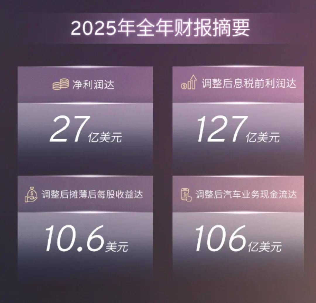 與此同時,通用汽車也出現了盈利下滑的跡象。數據顯示,通用汽車2025年營收1850.19億美元,保持穩定;凈利潤27.80億美元。不過,通用汽車調整后汽車業務現金流高達106億美元,作為轉型電動化的壓艙石,給到充足的信心。事實上,通用汽車優先保障現金流,平衡盈利與業務轉型的做法,也為其他傳統車企提供了有效的借鑒,正所謂“家有余糧、心里不慌”。