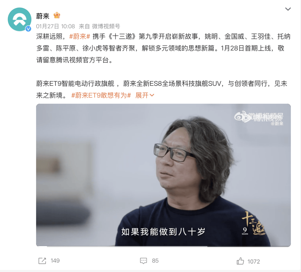 在車企普遍追求視覺化、接地氣和高流量時,蔚來逆向操作,選擇與《十三邀》合作,再一次凸顯了蔚來的調性。