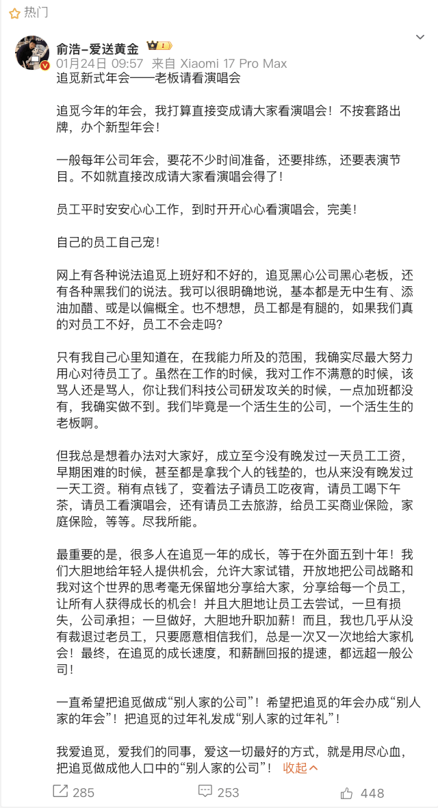 雖然造車還沒大成績,但追覓的年會卻早早秀出了圈。它爆改年會讓打工人準備節(jié)目的模式,采用老板“請看演唱會”,并提前爆料將有毛不易、張信哲、蕭敬騰等大咖出席,以“別人家的年會”著實出了一波圈,形成了企業(yè)蒸蒸日上的大眾印象。