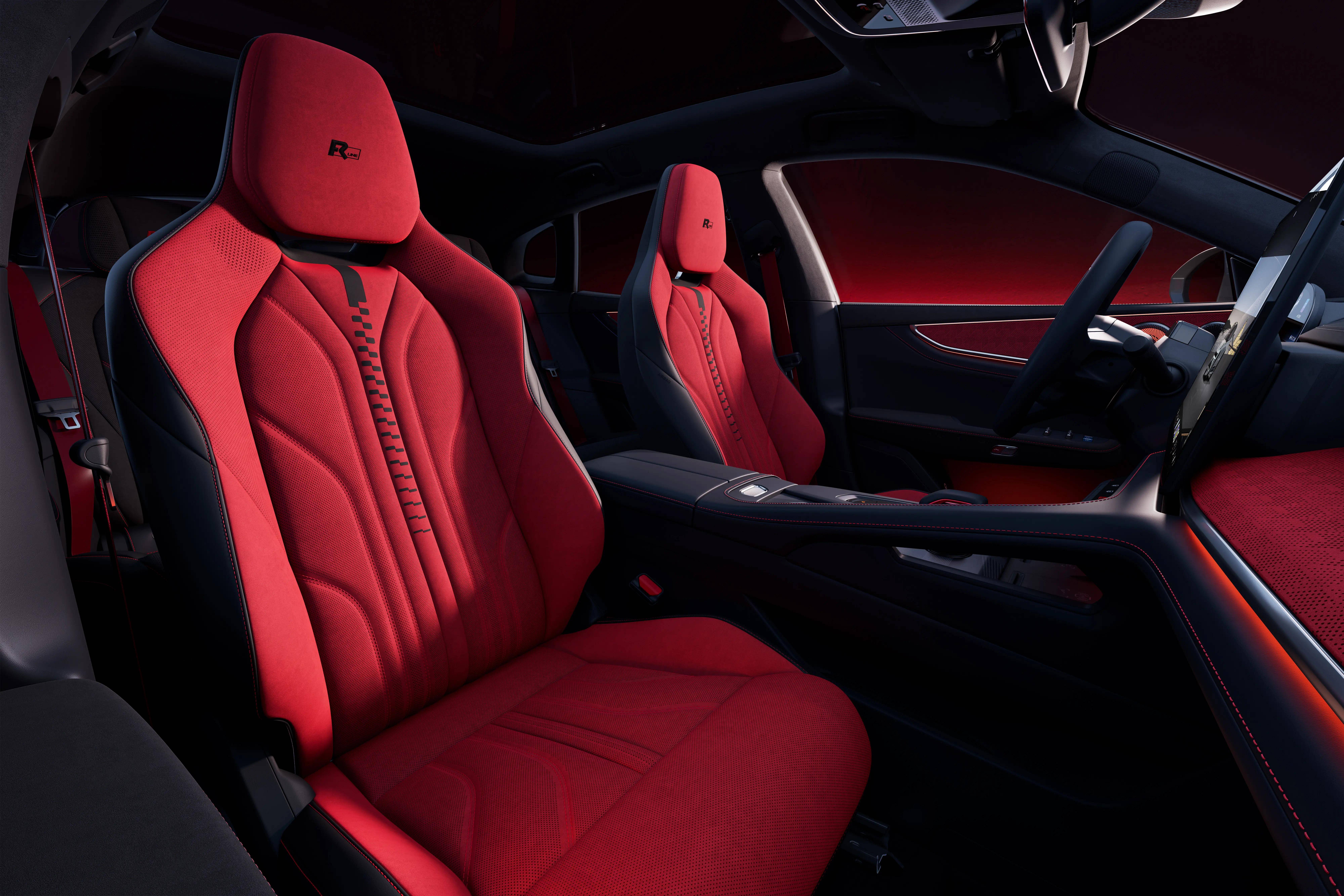 內飾采用黑曜紅配色,配備Dinamica麂皮絨性能座椅、FR-LINE刺繡標識及主駕座椅靠背主動側翼支撐。方向盤集成賽用雙控旋鈕,輔以FR-LINE迎賓踏板與性能金屬踏板。座艙搭載“星空音樂廳”系統,含4680瓦峰值功率、29揚聲器的7.1.4.8全景聲音響,前后排座椅均支持3D深層按摩、通風與加熱,并配備8英寸2K后排娛樂控制屏及自動感應門。
