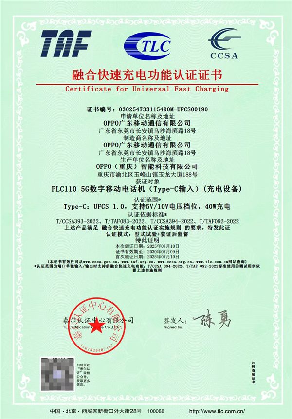 2025年6月1日起,UFCS 1.2認證開始實施并優化了UFCS認證管理機制,在手機等充電設備的UFCS認證證書上明示實測的UFCS互通充電功率水平,以更直觀地呈現UFCS卓越的兼容快充性能。