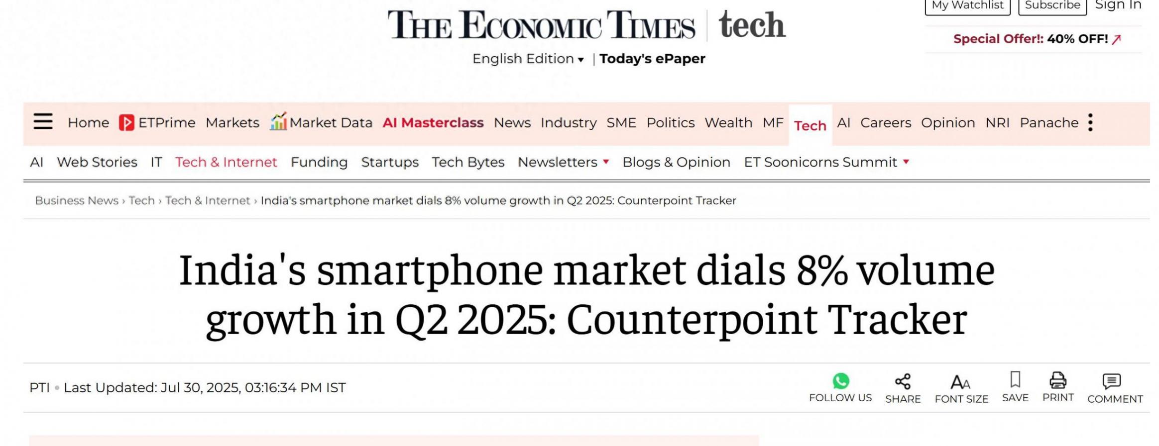 Counterpoint高級研究分析師Prachir Singh表示,印度智能手機市場在2025年第二季度的復(fù)蘇,還受到宏觀經(jīng)濟環(huán)境改善的積極影響,這提升了消費者信心和消費意愿。