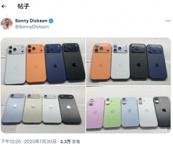 7月30日,博主@Sonny Dickson分享了一組iPhone 17的機模照片,展示了新機的多款配色,其中橙色首次出現。