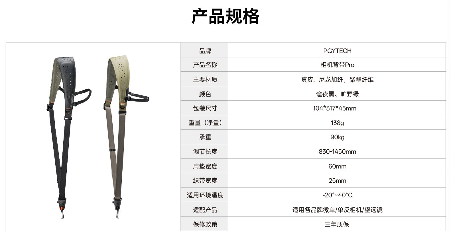 PGYTECH相機背帶Pro以及相機背帶Master均包含了謐夜黑與曠野綠兩種配色。兩款背帶主要材質均為真皮、尼龍加纖、聚酯纖維,并均采用了PGYTECH相機背帶特有的快拆設計。