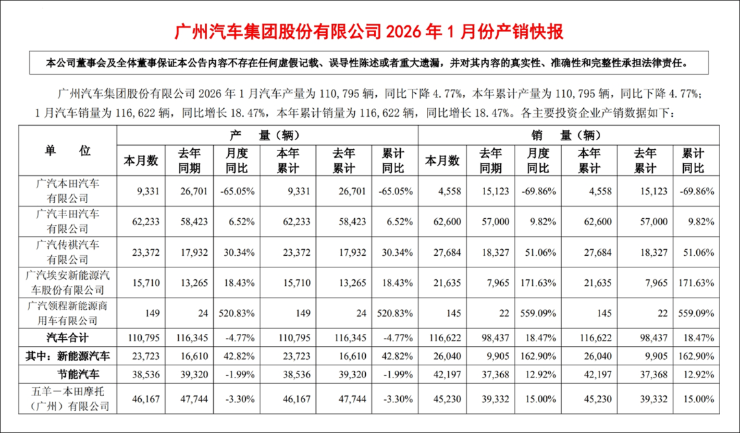 開年第一個月,以集團的口徑去看旗下品牌的銷量,好像還不錯。然而,2026年的中國車市究竟會一個怎么的開局拉開序幕,所有外部表現都很清楚地給廣汽提著醒。