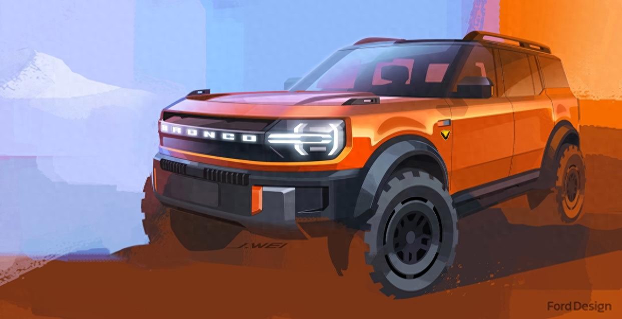 基于電動平臺的全新設計,即將推出的福特烈馬新能源,依然保留了烈馬家族最原始最本能的硬朗DNA。你能從燈組結構、輪拱造型以及A柱立角上找到1966年第一代Bronco的影子。