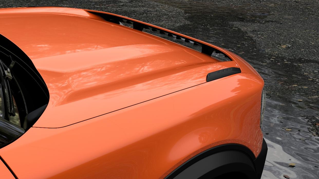 同樣的功能驅動造型的例子,還出現在輪圈設計上。全新定制的輪圈設計受到戶外越野防脫輪轂啟發,既能風阻優化,又能增強車輛的野性姿態。福特把烈馬新能源采用了高飽和度的“烈焰橙”車色,不管是在城市還是在戶外,都保證了高度的可識別性。