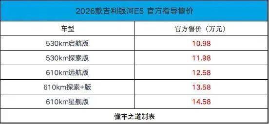 7月24日,2026款吉利銀河E5正式上市,新車共推出5款車型,售價(jià)區(qū)間為10.98-14.58萬元,與老款車型保持一致。新車針對外觀、內(nèi)飾以及動(dòng)力系統(tǒng)均進(jìn)行了不同程度的升級。