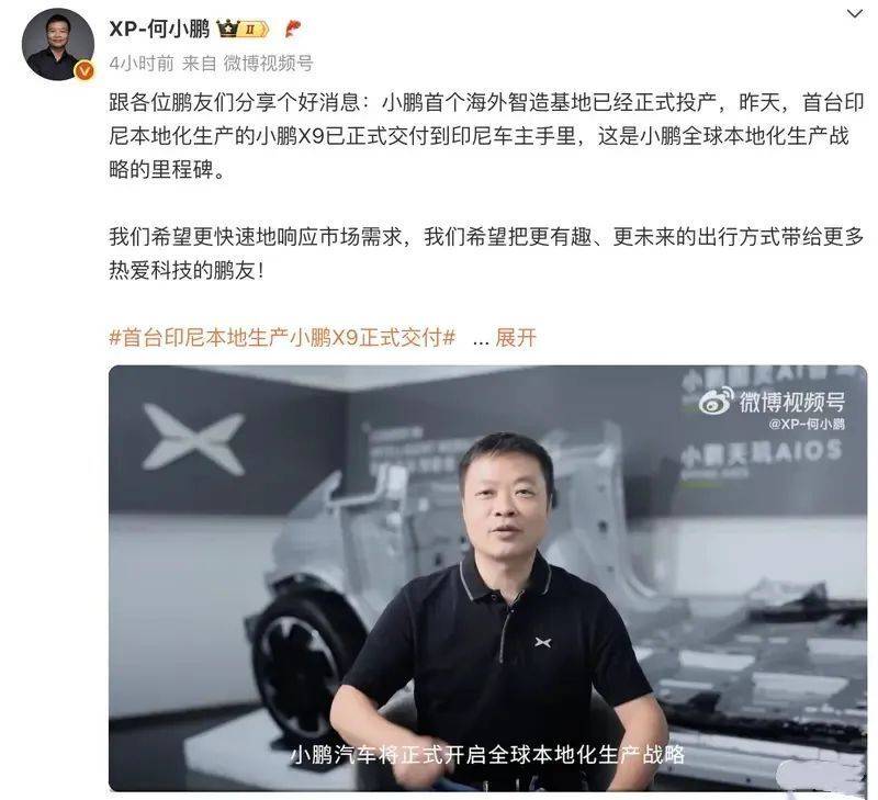 今日,董事長兼CEO何小鵬通過視頻宣布:“印尼成為小鵬在全球第一個落地本地化生產的國家,從印尼開始,小鵬汽車將正式開啟全球本地化生產戰略。”