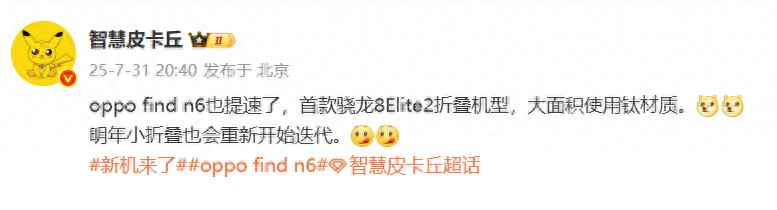 最近數(shù)碼圈關(guān)于OPPO下一代折疊屏旗艦的爆料突然多起來了!博主@智慧皮卡丘 近日透露,OPPO Find N6的研發(fā)進(jìn)度明顯提速,新機(jī)將成為首款搭載驍龍8 Elite 2的折疊屏機(jī)型,并且會(huì)大面積使用鈦材質(zhì)。同時(shí),明年OPPO的小折疊產(chǎn)品線也會(huì)重新開始迭代。特別值得注意的是,在爆料中被問及“超大杯(通常指影像頂配版)鏡頭質(zhì)(凸)起控制得怎么樣?”時(shí),@智慧皮卡丘 非常肯定地強(qiáng)調(diào):“oppo是最薄的。”