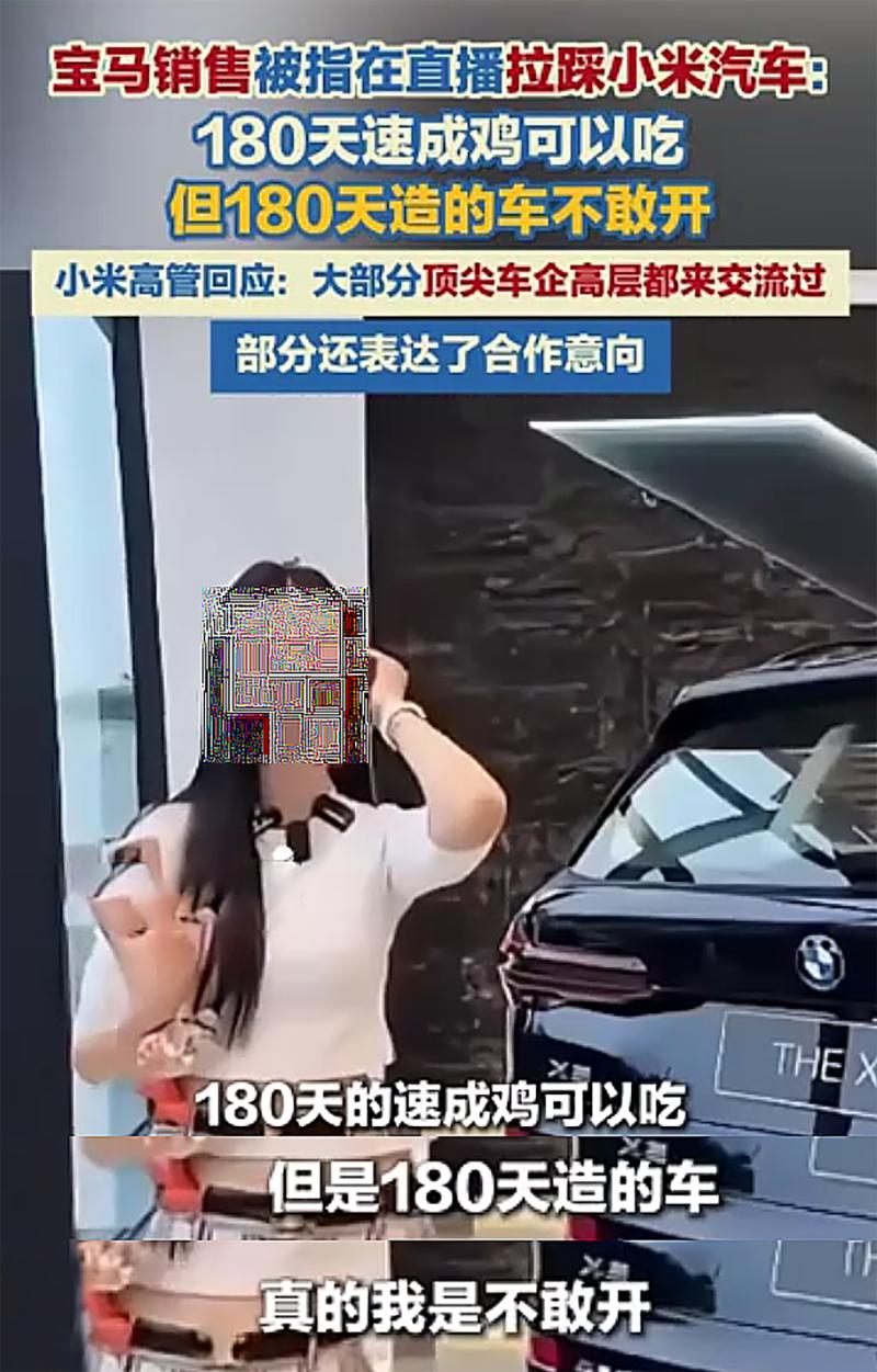 3月10日,一名寶馬汽車銷售人員在直播售車的時候,將小米汽車暗諷為“180天車”并稱“180天的速成雞可以吃但180天造的車真的是不敢開。”甚至以“雜糧品牌”諷刺小米汽車。這樣的描述沒有給予客觀事實,缺乏對車輛實際體驗的評價,更多是情緒上的主觀惡意評價;寶馬汽車、巴伐利亞發動機廠,其作為德國百年汽車制造商應當對其銷售人員的言論負責,對于競爭競品和產品應當保留有最起碼的尊重,這是商業道德的體現。