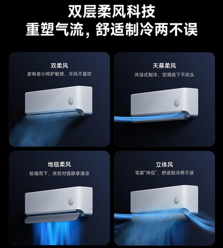 這空調(diào)的核心賣點(diǎn)之一就是這個(gè)“雙層柔風(fēng)科技”。它不是什么復(fù)雜的電子技術(shù),而是實(shí)實(shí)在在的物理設(shè)計(jì)。通過(guò)特殊的風(fēng)道和導(dǎo)風(fēng)板結(jié)構(gòu),把強(qiáng)勁的冷風(fēng)“打散”、“揉碎”。