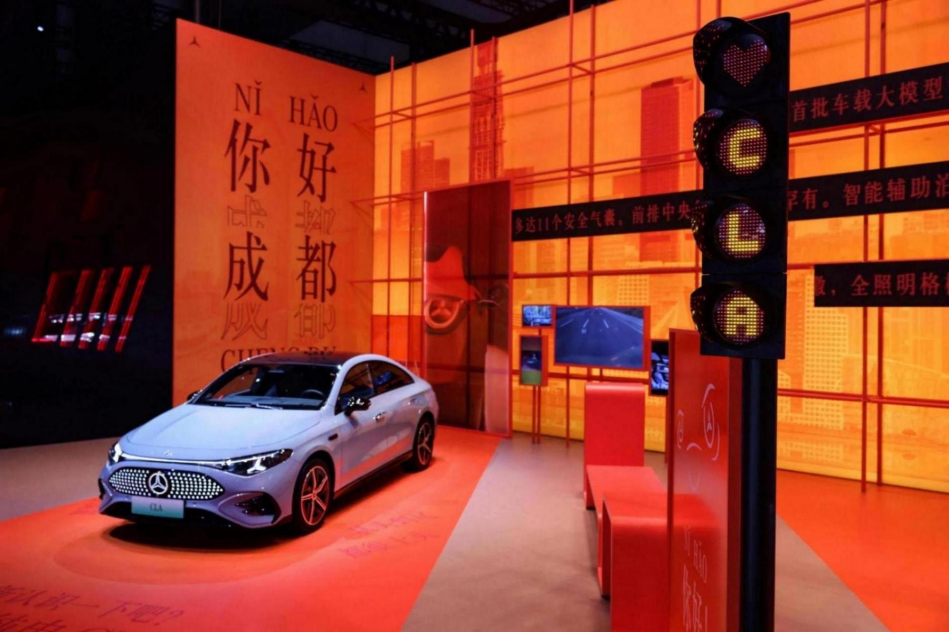 展臺布置上,奔馳圍繞全新純電戰(zhàn)略級新品CLA,打造了一個時尚街區(qū),用橙色的燈光營造出熱烈又有活力的氛圍,“你好,成都”字樣搭配城市建筑圖案,更突出奔馳對于此次成都車展的用心。