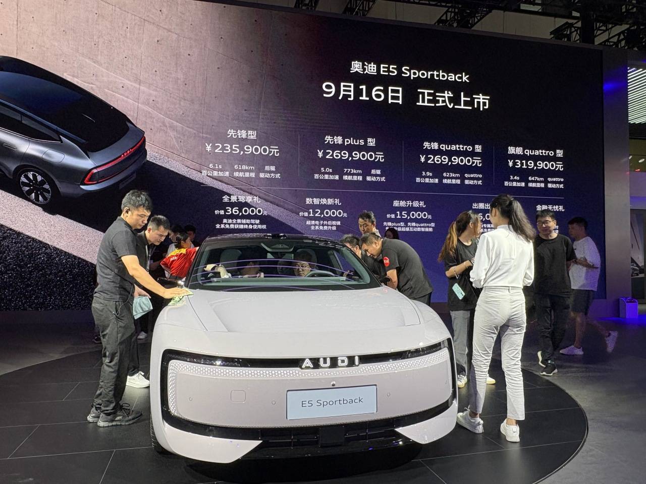 上汽奧迪展臺的熱度,則集中在三臺E5 sportback展車上。對于這款新能源車,銷售表示,來看這款車的年輕人較多,大多數(shù)是被這款車的外觀和智駕吸引,其中男生主要選擇先鋒quattro版,女生則優(yōu)先考慮先鋒Plus版。