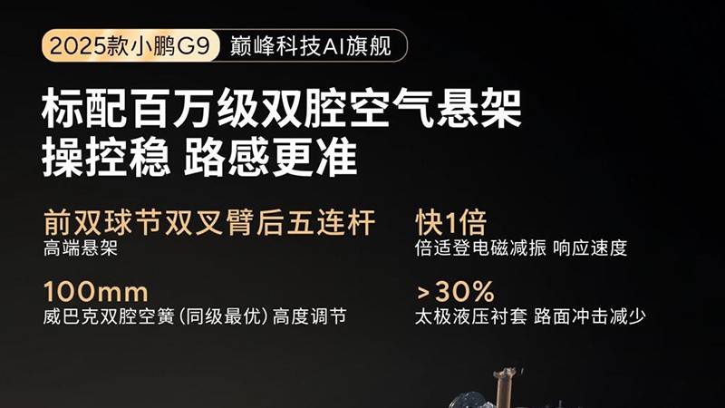從今年年初至今,小鵬陸續(xù)發(fā)布了2025款小鵬X9、2025款G9/G6,全新P7等重磅新車。其中,2025款小鵬G9、全新小鵬P7都明確標(biāo)注了采用進(jìn)口的“威巴克雙腔空簧”。
