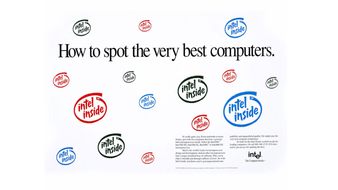 1991年,英特爾以“Intel Inside”計劃開啟聲勢浩大的宣傳活動,它鼓勵I(lǐng)BM、康鉑、戴爾這些電腦制造商把“Intel Inside”標志用在其產(chǎn)品廣告和包裝上,條件是英特爾支付這些公司40%的聯(lián)合廣告費用。