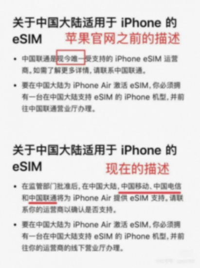 讓小雷驚喜的是,就在我梳理這些運營商動態的時候,又刷了遍 iPhone Air 的官網頁面,發現底下關于 eSIM 支持的描述居然也更新了。之前明寫的 “僅有中國聯通為本產品提供 eSIM 支持”,現在直接改成了“中國移動、中國電信和中國聯通將為本產品提供 eSIM 支持”。