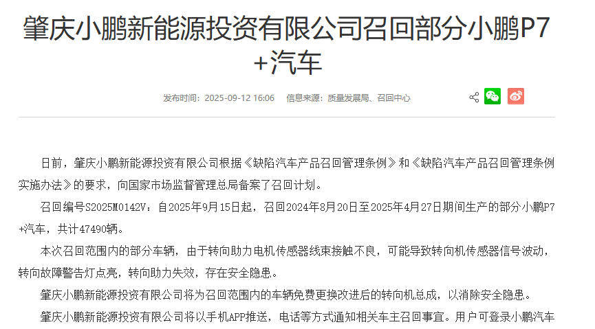 日前國家市場監督管理總局發布消息,表示肇慶小鵬新能源投資有限公司根據《缺陷汽車產品召回管理條例》和《缺陷汽車產品召回管理條例實施辦法》的要求,向國家市場監督管理總局備案了召回計劃。