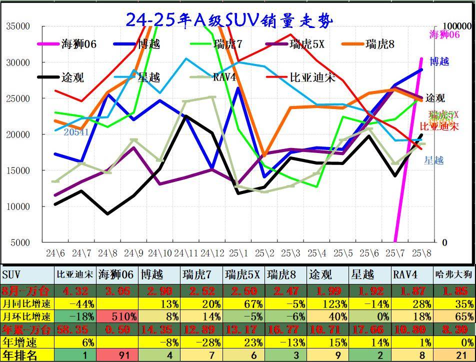 主流SUV市場(chǎng)格局迅速變化,比亞迪和吉利、長(zhǎng)安、奇瑞的SUV 表現(xiàn)超強(qiáng),實(shí)現(xiàn)了自主SUV的國(guó)內(nèi)外全面突破。